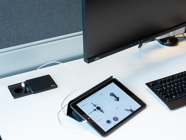 In the customer service areas, the BUWOG advisors join forces with their customers to develop concepts for designing apartments. To underpin digital planning, EVOline modular U-Docks are fitted to the conference tables. Thanks to the fitted solution’s custom-configurable hub, advisors can access all the power, data and multimedia modules they require at any time. On the other hand, single workspaces come with the Square80 to provide electricity, access to the network and charging capabilities in one.
