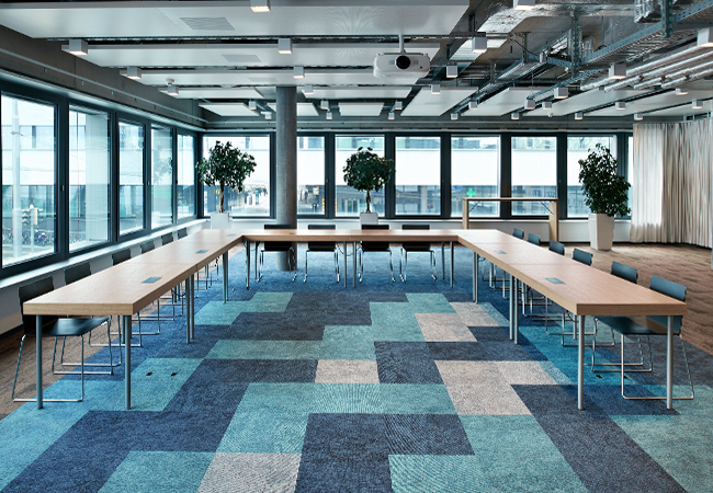 L'interno delle aule di formazione è curato nei minimi dettagli: le generose finestre inondano le stanze di luce, rendendole luminose e invitanti. In combinazione con le moquette colorate, si crea un senso di leggerezza, motivando tutti i partecipanti verso un nuovo inizio – sia che si tratti di imparare una nuova lingua o di continuare la propria formazione.
