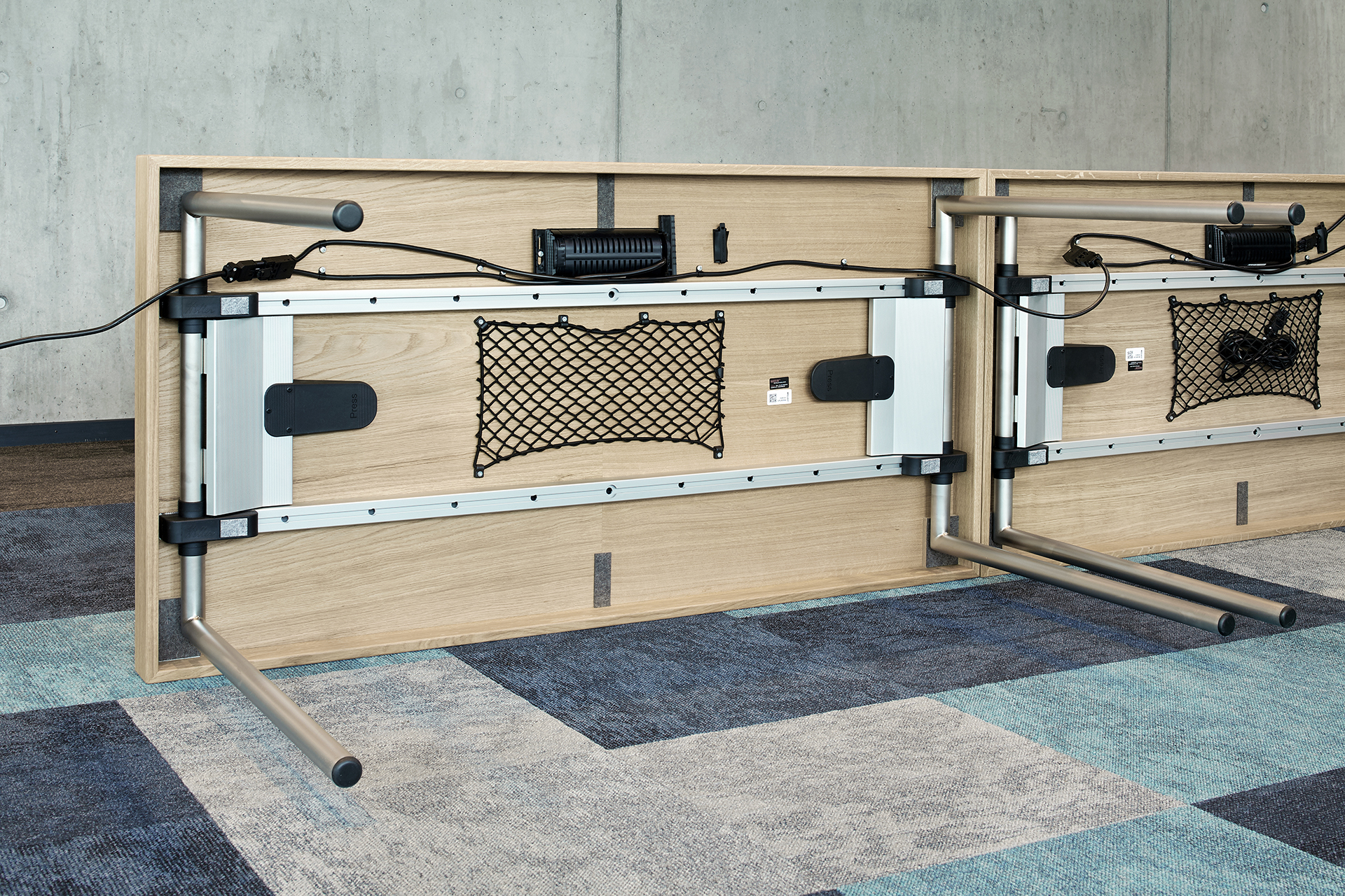 Parte dell’innovativo concetto della maggiore Scuola Club della Svizzera è l'uso flessibile delle aule di formazione. A tale scopo sono stati realizzati tavoli pieghevoli elettrificati, che possono essere collegati l'uno all'altro con semplici connettori e possono essere montati e smontati in un batter d'occhio a seconda del numero di partecipanti e delle dimensioni della sala. Se non tutti i tavoli sono necessari, una pratica scatola per il trasporto offre sufficiente spazio di stoccaggio: le “Tour Cases” su ruote, note negli allestimenti scenografici, possono essere aperte di lato, consentendo così di estrarre o inserire comodamente i tavoli. Un pannello di legno appositamente adattato sulla parte superiore della cassa trasforma l'oggetto in un elegante tavolo alto.