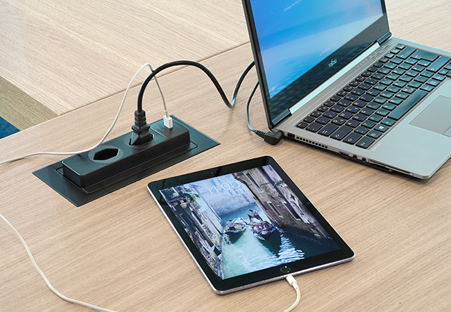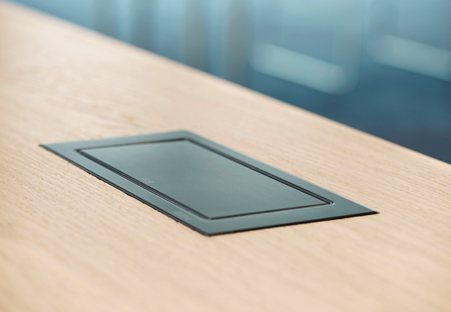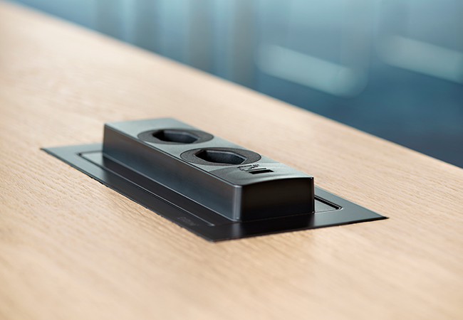 A questo scopo gli interior designer hanno scelto l'elemento di installazione EVOline BackFlip di Schulte Elektrotechnik, che ha vinto due premi di design e ha un aspetto elegantemente sobrio. È integrato a filo nella superficie del tavolo, l'inserto ruota verso l'alto con un leggero tocco per rivelare due prese e un caricatore USB. Nella sua finitura nera opaca, l'elemento di elettrificazione si accorda inoltre armoniosamente con le Tour Cases realizzate appositamente per i tavoli.