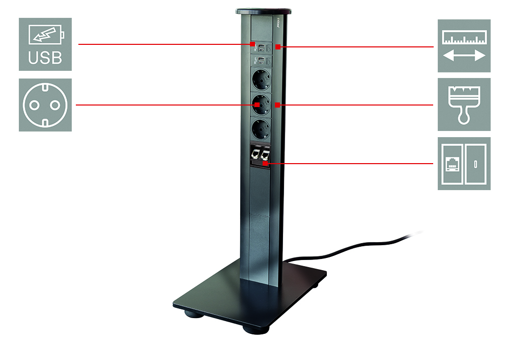 Mit einer Höhe von bis zu 1,20 m macht der Vertical das mühselige Bücken nach Steckdosen überflüssig. Strom-, Multimedia- und Datenanschlüsse sind in bequemer Höhe erreichbar.